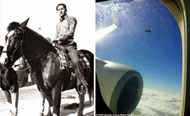 A la izquierda, Jack LeMonde, que sirvió a los EE.UU. en el Cuerpo de Marines, fue fotografiado a caballo cerca de los establos Pickwick Riding en Burbank, California en una mañana de junio de 1945. Un OVNI se puede ver en la imagen a la derecha de la oreja del caballo. A la derecha un pasajero en un avión procedente de Hong Kong para el suroeste de China afirmó haber visto un «OVNI fuera de la ventanilla del avión en 2012.