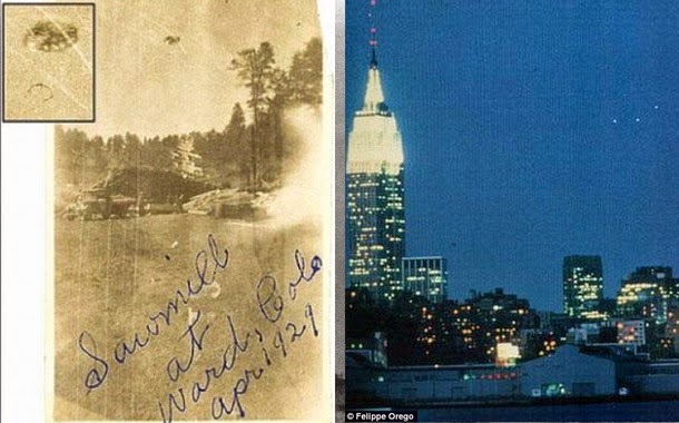 A la derecha es una imagen tomada por Felippe Orego mostrando tres luces sobre el horizonte de Manhattan, Nueva York, el 9 de mayo de 1984. La imagen de la izquierda, supuestamente muestra un ovni, está foto fue tomada en Ward, Colorado en 1929.
